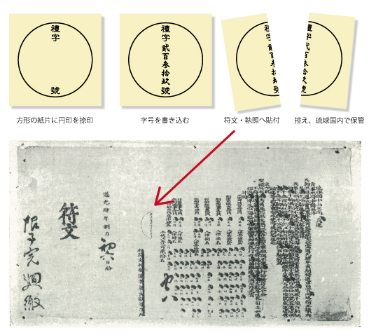 その提案とは、中国の民間商船が琉球との間で毎年1〜2隻を上限として交易することを許可してほしいというものでした。この時、明側がもっとも警戒したのは、民間船による密貿易です。このため、不正な貿易を防ぐ仕組みとして、明側は渡航証明書である「引」(「号引」)を発給し、さらに船の真偽を琉球側でもチェックするため「勘合印信」を用いてはどうかと提案しています。いわく「船隻の往来は、卑国、号引を詳査し、給するに勘合印信を以てし、回に照らして査験せん」(船の往来の管理について、琉球で引の号数を詳しく調べ、勘合を付した文書を発給することで、戻ってきた際に照合して検査する)と言うのです。